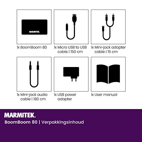 Met de BoomBoom 80 kunt u draadloos muziekstreams van uw smartphone/tablet naar uw stereo-installatie overbrengen. Je sluit de bluetooth-audio-adapter eenvoudig aan op je stereo-installatie. Kort aan elkaar koppelen en verbind je favoriete muziek van Spotifty Fortan in een veel betere geluidskwaliteit dan van je telefoon. De Marmitek BoomBoom 80 heeft NFC. Als je smartphone deze functie ook ondersteunt, wordt je smartphone of tablet direct gekoppeld als je hem erlangs beweegt. Nadat er een verbinding is gemaakt, zal de door jou op je smartphone/tablet gekozen muziek op je stereo-installatie klinken. Je smartphone beschikt niet over NFC? Ook dan kun je de BoomBoom 80 probleemloos gebruiken. De set bevat: Bluetooth muziekontvanger, micro USB-kabel 150 cm, stereo jack kabel 180 cm, converterkabel 15 cm, voedingsadapter