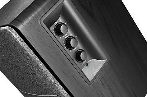 Knapperig geluid en tijdloos design – de R1280T maakt indruk met zijn geluidseigenschappen en is dankzij dubbele stereo-ingangen veelzijdig inzetbaar. Het luidsprekersysteem uit de Edifier Studio-serie produceert met zijn 42 watt RMS uitgangsvermogen indrukwekkende en ruimtelijke geluidsresultaten. De luidsprekers beschikken over bass reflexkanalen aan de voorkant, die voor een krachtige en nauwkeurige bas zorgen. Het geluidssysteem kan dankzij de geïntegreerde versterker direct met alle stereobronnen, zoals tv of pc, worden verbonden. De luidsprekers zijn ondergebracht in een behuizing van echt hout, wat bijdraagt aan de uitstekende geluidseigenschappen van het 2.0-systeem. Aan de zijkant van de actieve luidspreker bevinden zich de bedieningselementen. Via drie draaiknoppen kunnen de basintensiteit, hoge tonen en het volume nauwkeurig op het gewenste niveau worden ingesteld. Bovendien kan via de elegante infrarood afstandsbediening gemakkelijk op afstand het volume worden ingesteld en het systeem worden gedempt.