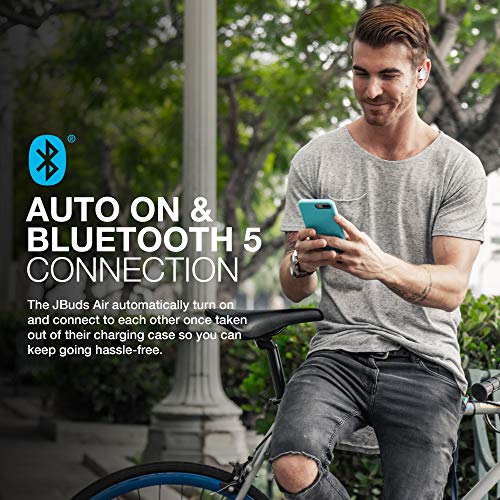 AUTOMATISCH AAN EN VERBINDEN: De JBuds Air True Wireless Earbuds gaan automatisch aan en maken automatisch verbinding met elkaar. Haal ze gewoon uit hun usb oplaadetui voor een naadloze, probleemloze aansluiting