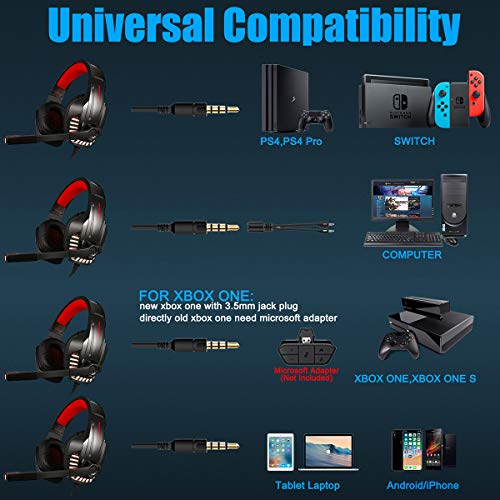 Brede compatibiliteit – Deze PS4-gamingheadset is uitgerust met een 1-naar-2 3,5 mm jack-splitterkabel (Bonus). Ondersteunt voor PlayStation 4, PS4 Pro / Slim, nieuwe Xbox One, Xbox One S / X-controller, pc, Nintendo Switch / 3DS, laptop, PSP, tablet, Mac, iPad, computer, mobiele telefoon, etc. Let op: je hebt een extra Microsoft-adapter (niet inbegrepen) bij verbinding met een OUDE VERSIE Xbox One-controller.
