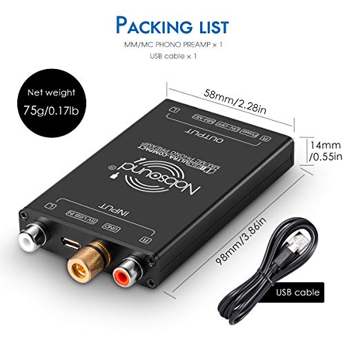 Voordelen: ① T1 Pro is de kleinste MM MC phono preamp op de markt. Het mini-formaat en het lichte gewicht maken het gemakkelijk vast te houden en gemakkelijk mee te nemen. Het keurt high-end schurende blasting behandeling, laserbelettering, geen kleurvervaging en verandert na langdurig gebruik.
