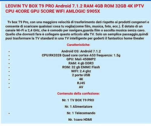 Met deze gloednieuwe tv-box verander je je oude tv in een moderne smart tv. Eenvoudige bediening met deze Android-tv-box maakt het mogelijk om games te spelen, films te kijken en Android-apps direct vanaf je tv te gebruiken. Het Android-besturingssysteem garandeert een vloeiende en krachtige gebruikerservaring. Je hebt genoeg ruimte voor games, apps en bestanden. Ondersteunt 4K multimedia-bestanden voor een authentieke filmervaring. Om je multimedia-ervaring nog verder te verhogen, ondersteunt deze Android-tv-box de 2,4 GHz draadloze connectiviteit en maakt het mogelijk om zelfs direct vanaf je tv op het internet te surfen. CPU: Quad Core ARM Cortex A53 tot 2 GHz GPU: Arm Dvalin MP2 GPU Flash: 16 GB/32 GB SDRAM: DDR3 2 GB/DDR4 4 GB Stroomvoorziening: DC 5 V/1 A. Eigenschappen: Android 8.1 1 x USB-ingang 1 x TF-kaartingang (niet meegeleverd). Taal. Frans Engels Duits Spaans Italiaans etc… Dual Wifi Bluetooth: 4.2 HDMI:HDMI2.1, ondersteuning HDMI CEC, DynamicoHDRE HDCP 2.2, 4Kx2K-75 max. Uitgangsresolutie. Inhoud: -1 x T9PRO -1 x afstandsbediening -1 x microkabel HDMI -1 x IR-kabel -1 x gebruikershandleiding