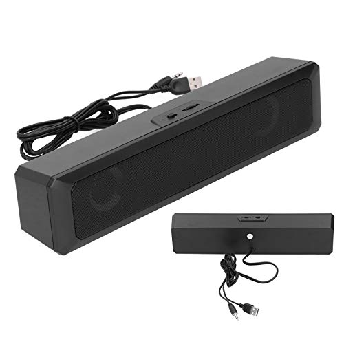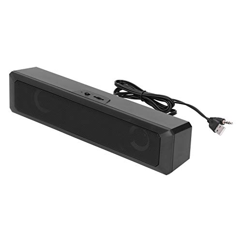Bedrade lange soundbar, aangesloten op een USB-datakabel, handig en praktisch.